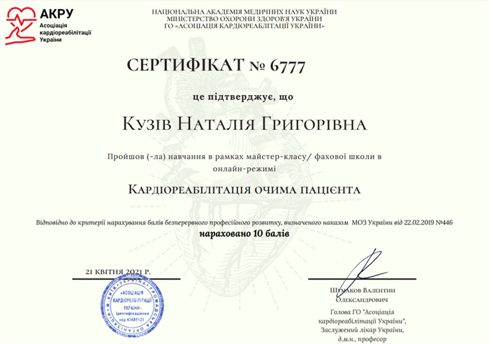 – майстер-клас "Нові Українські Рекомендації по реабілітації пацієнтів після перенесеного інфаркту міокарда-авторське бачення до публікації"