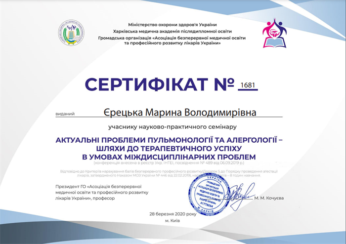 2016- курси спеціалізації з пульмонології (ХМАПО, м. Харків)